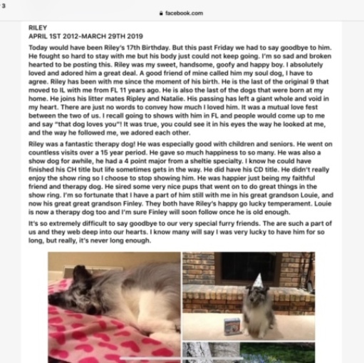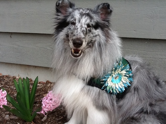Riley has a goofy, happy go lucky personality. He is a constant shadow and is always so happy to see Wendy, even if she is only gone from his sight for a short time. He is very affectionate and loves to give hugs and kisses, he hugs by using his front paw and legs to wrap around hiw owners leg, he does this on his own and on command. He also loves to "sing", he is the first one to start the choir practice at home and then his other Sheltie brothers & sisters join in the fun. |
