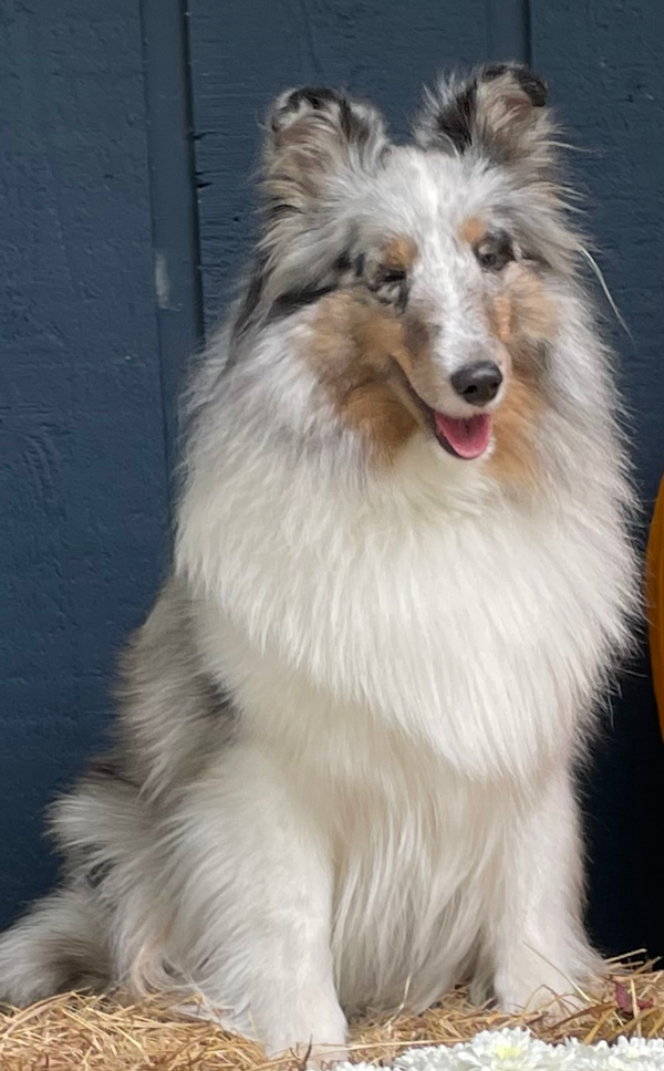 Daisy is a cuddle bug, she loves to cuddle close to others. At the end of the day she will sit in my lap as I watch TV on the couch. She actively watches TV with me. Her favorite programs are ones with animals in them. She will bark if another dog barks on TV. She does not like scary movies, she will leave the room if a scary movie is on. Daisy is very sweet, but she also has a naughty side to her when she bosses her three Sheltie brothers around at home. Being a herding breed she enjoys “herding” the squirrels in our back yard. She absolutely LOVES freshly fallen snow. She will run and jump high in the air with great enthusiasm when there is fresh snow on the ground. It’s pure joyfulness! Her favorite treat is strawberries. |